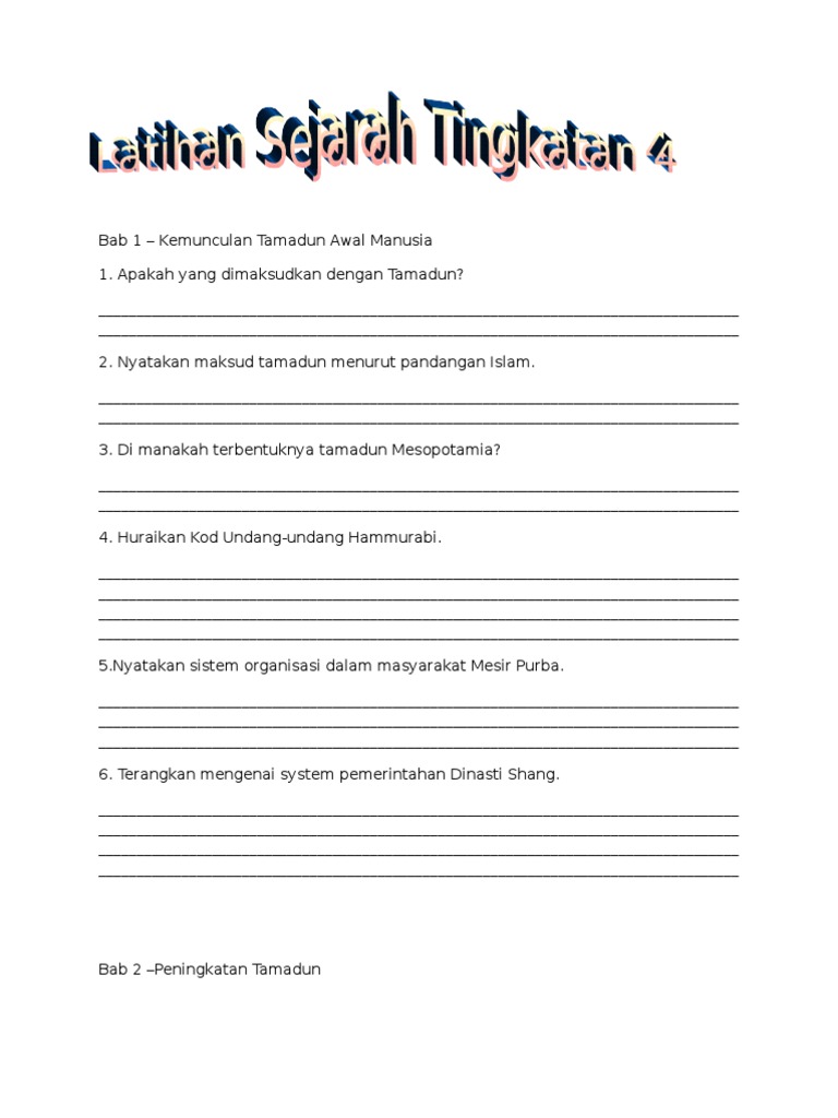 Contoh soalan sejarah tingkatan 4 bab 1 kertas 2 bm contoh soalan sejarah tingkatan 4 bab 1 kertas 2 bahasa. Kongsi dan muat turun KOLEKSI SOALAN PDPR SEJARAH KSSM TINGKATAN 2 secara percuma. NOTA SEJARAH TINGKATAN 4 1 Nag2oO9 TINGKATAN 4 Item Struktur Muka surat 4-8 1 Kreatif dan inovasi manusia dalam kehidupan seharian merupakan proses pembentukan tamadun.